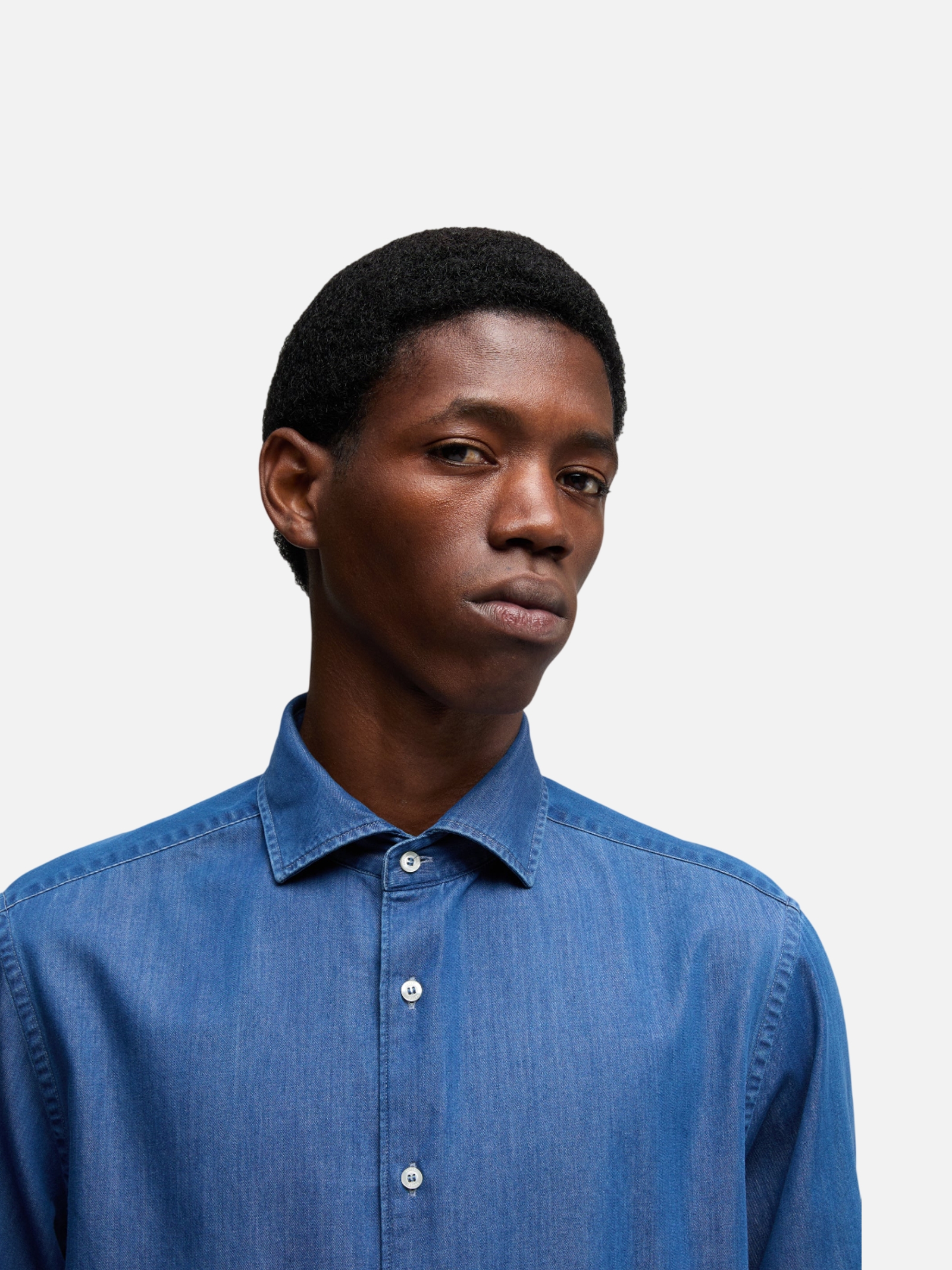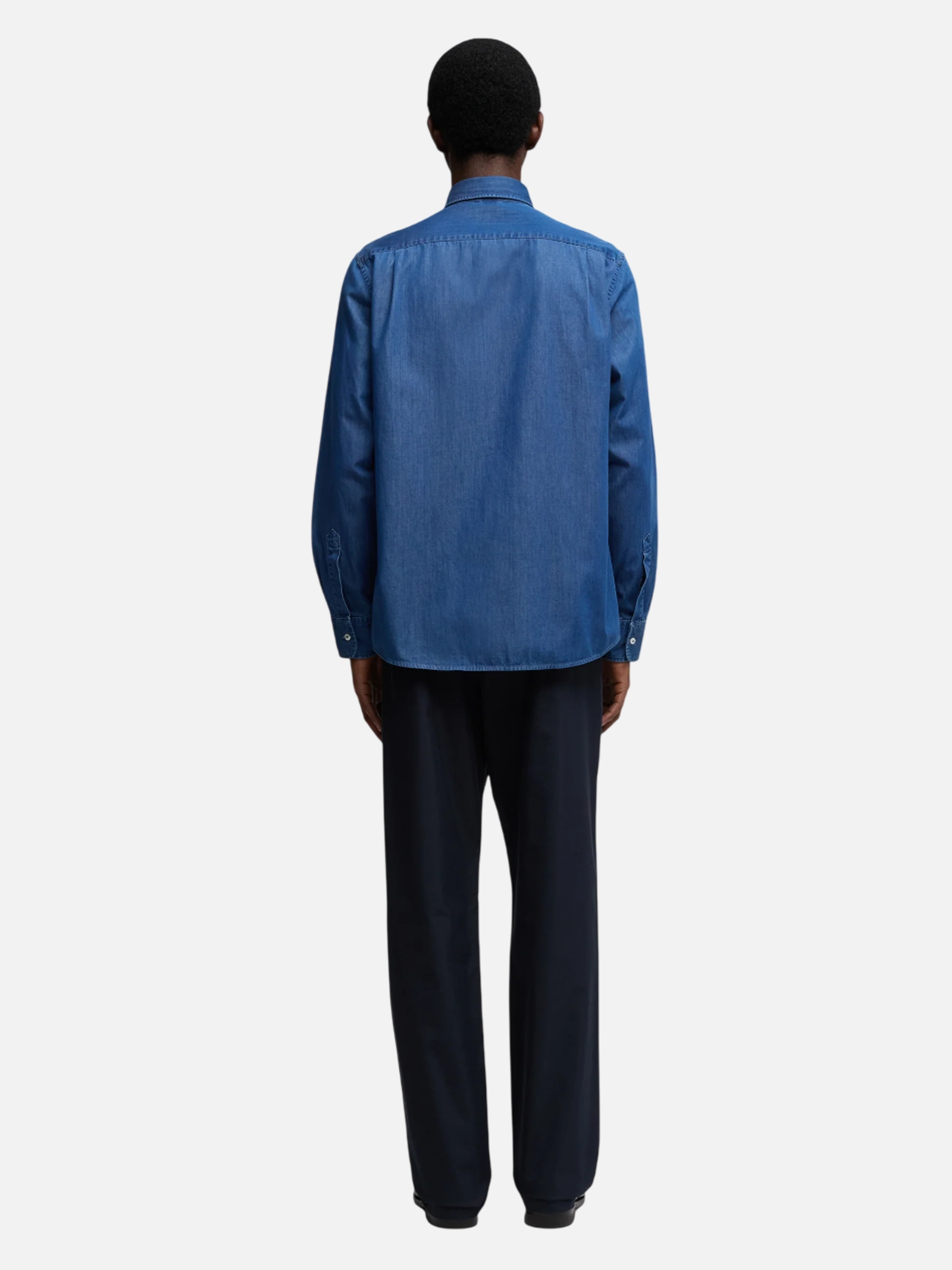 • Camicia in micro twill di chambray , collo francese e 2 pince sul taglio carre. Vestibilita regolare.