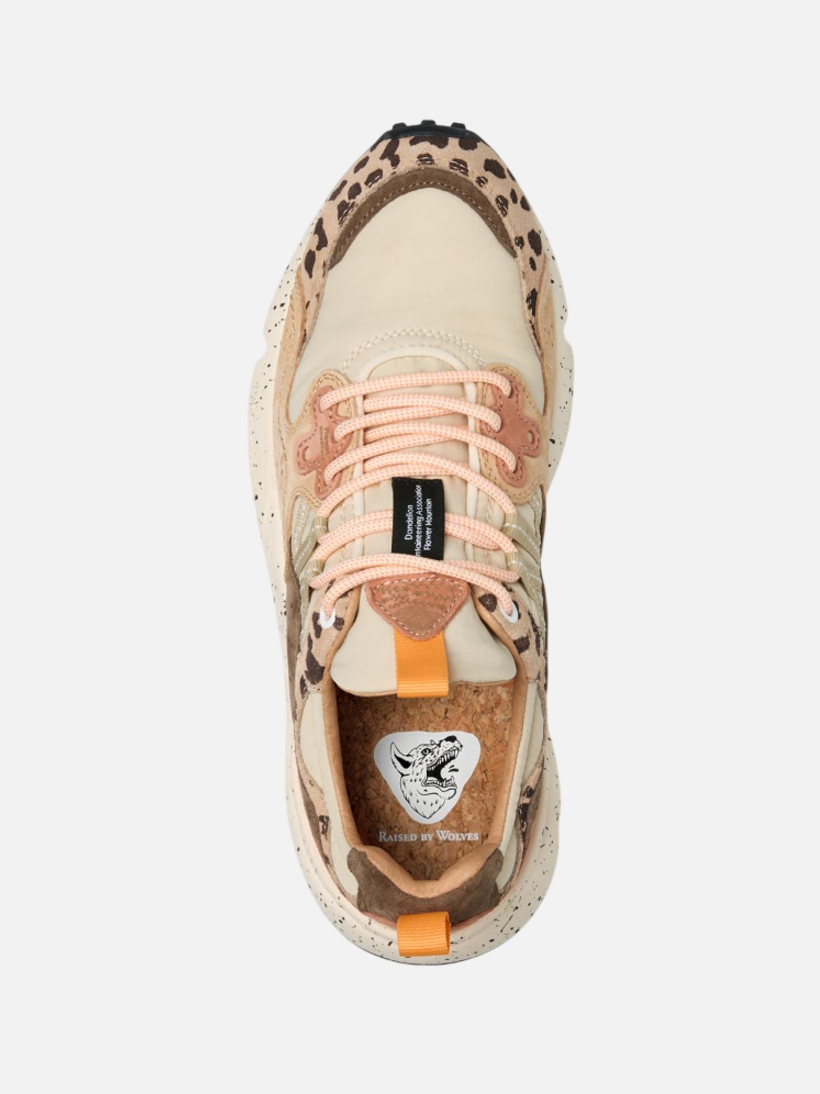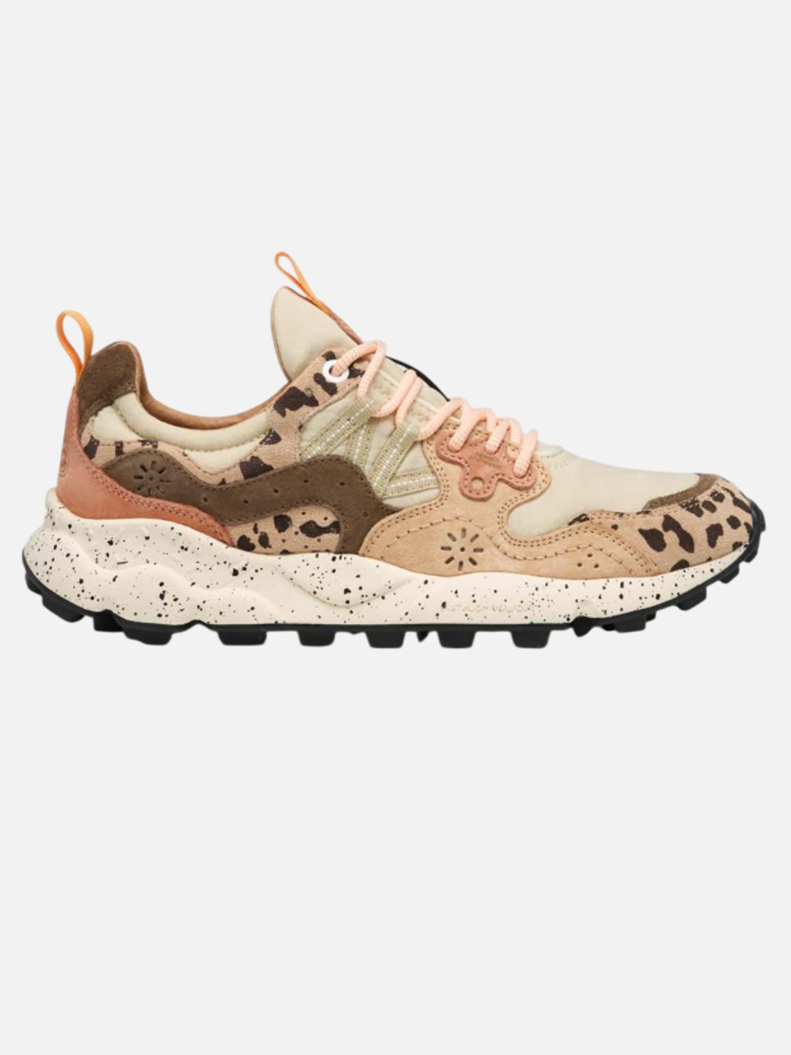 • Sneaker outdoor con tomaia in tessuto tecnico e inserti in suede full color e con stampa animalier. Gli occhielli rinforzati e i lacci trekking si abbinano alle traforature laterali. Soletta interna estraibile in sughero naturale con forma anatomica e trattamento antibatterico. Fondo in gomma ultra leggera con battistrada dentellato.