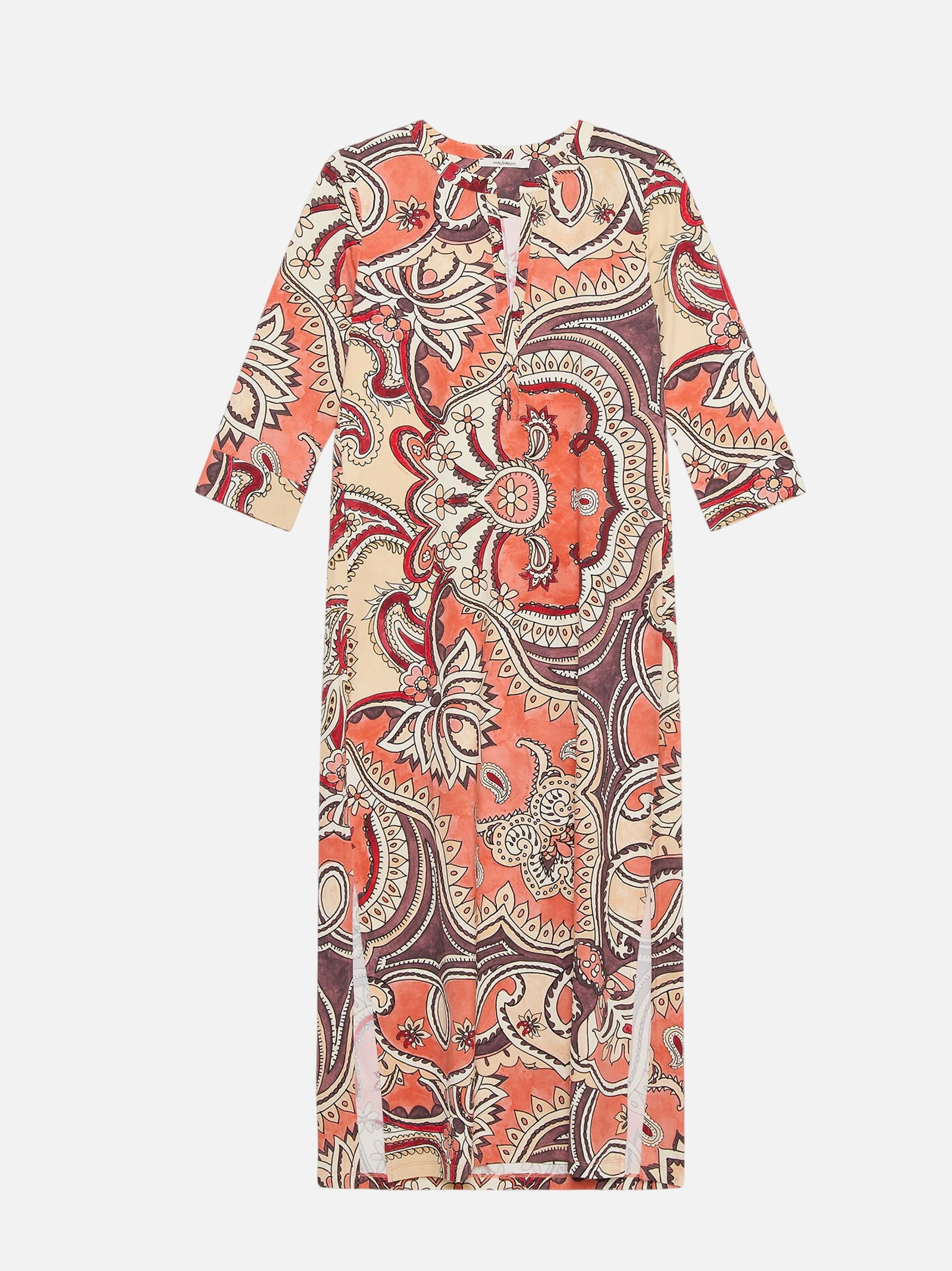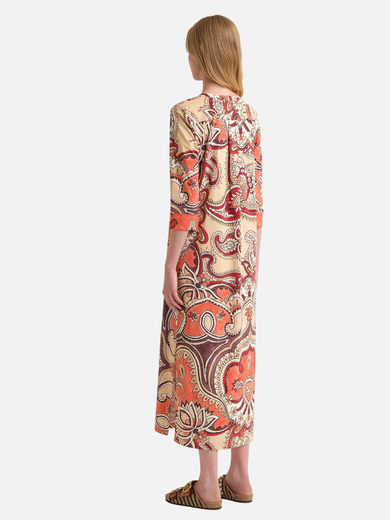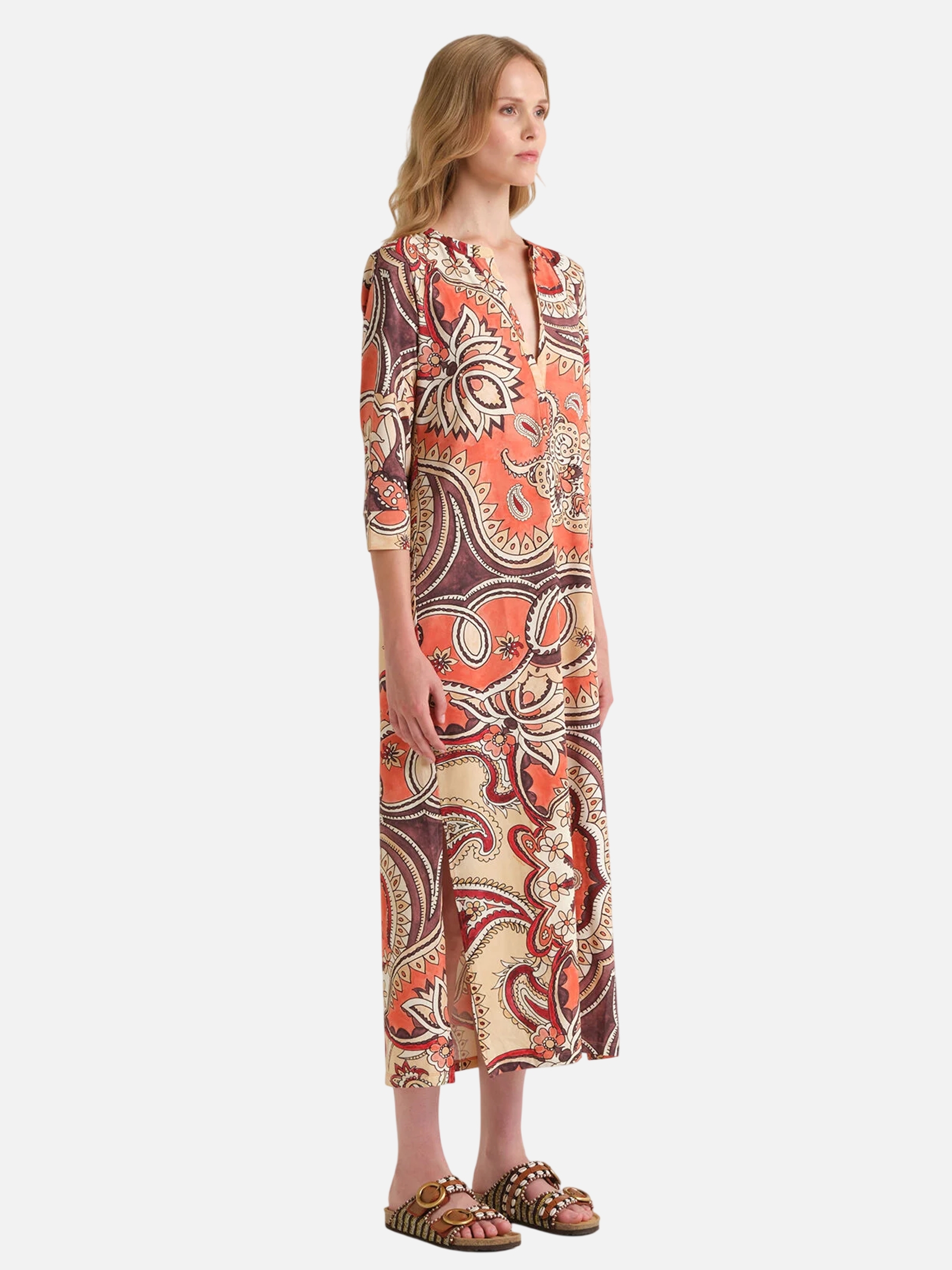 • Kaftano lungo in jersey leggero. Lo scollo profondo e gli spacchi laterali donano movimento e femminilità. La stampa maxi paisley all over illumina il capo con tonalità vibranti e armoniose. Fresco, comodo e versatile, è perfetto da indossare come abito da giorno o come copricostume raffinato, con accessori naturali e sandali flat.