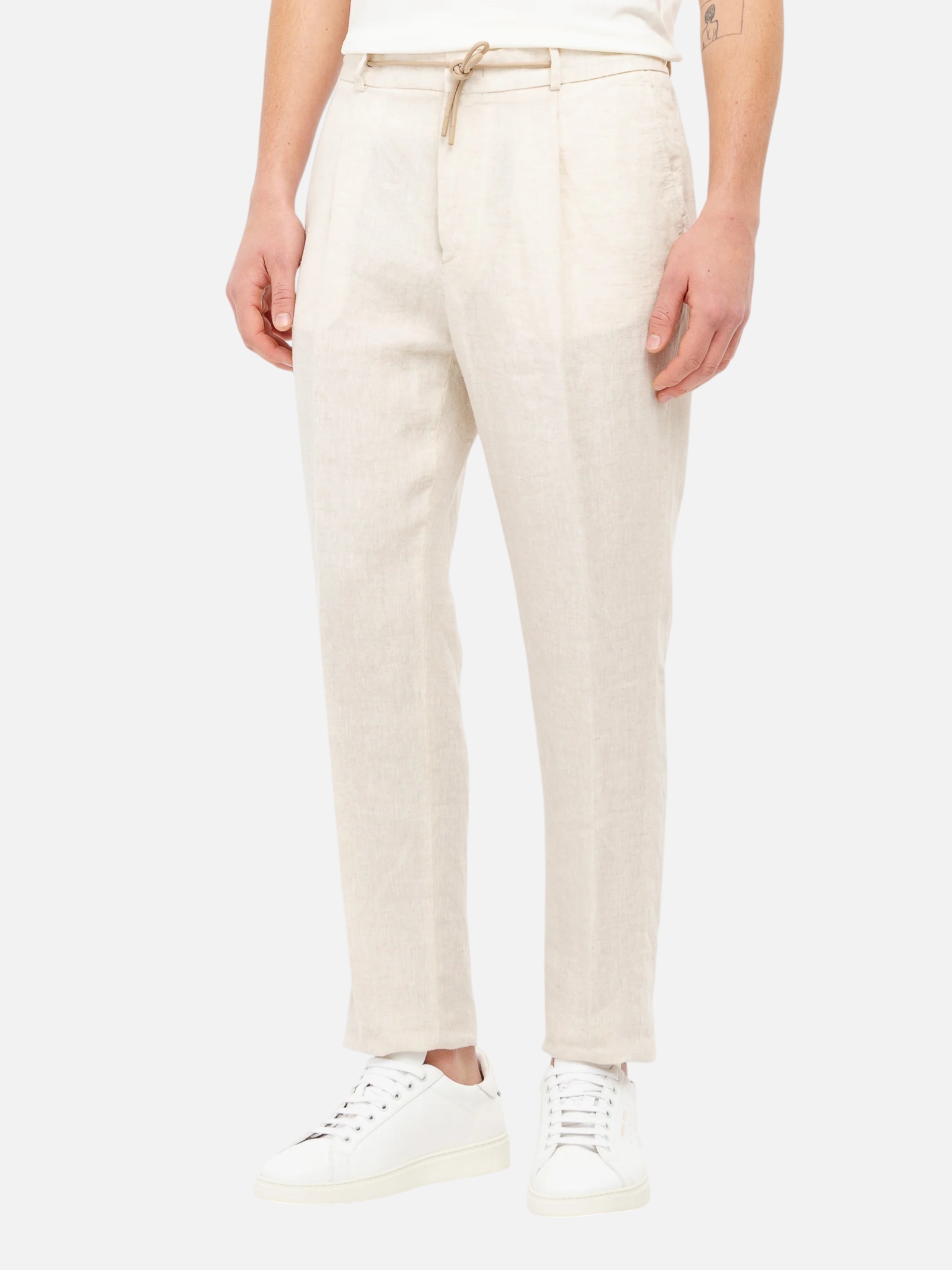 • Pantalone jogging lavato, slim fit con una pinces, elastico e coulisse in vita, due tasche america frontali, due sul retro a filo con bottoncino, chiusura con zip, gancio e bottone, fondo 18 cm. Tela in puro lino