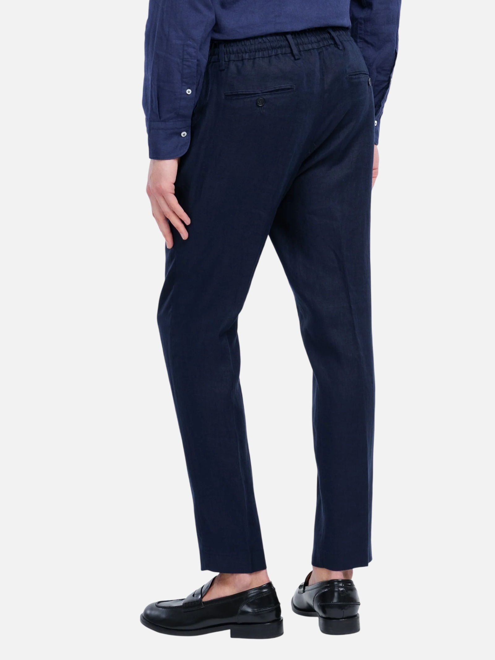 • Pantalone jogging lavato, slim fit con una pinces, elastico e coulisse in vita, due tasche america frontali, due sul retro a filo con bottoncino, chiusura con zip, gancio e bottone, fondo 18 cm. Tela in puro lino