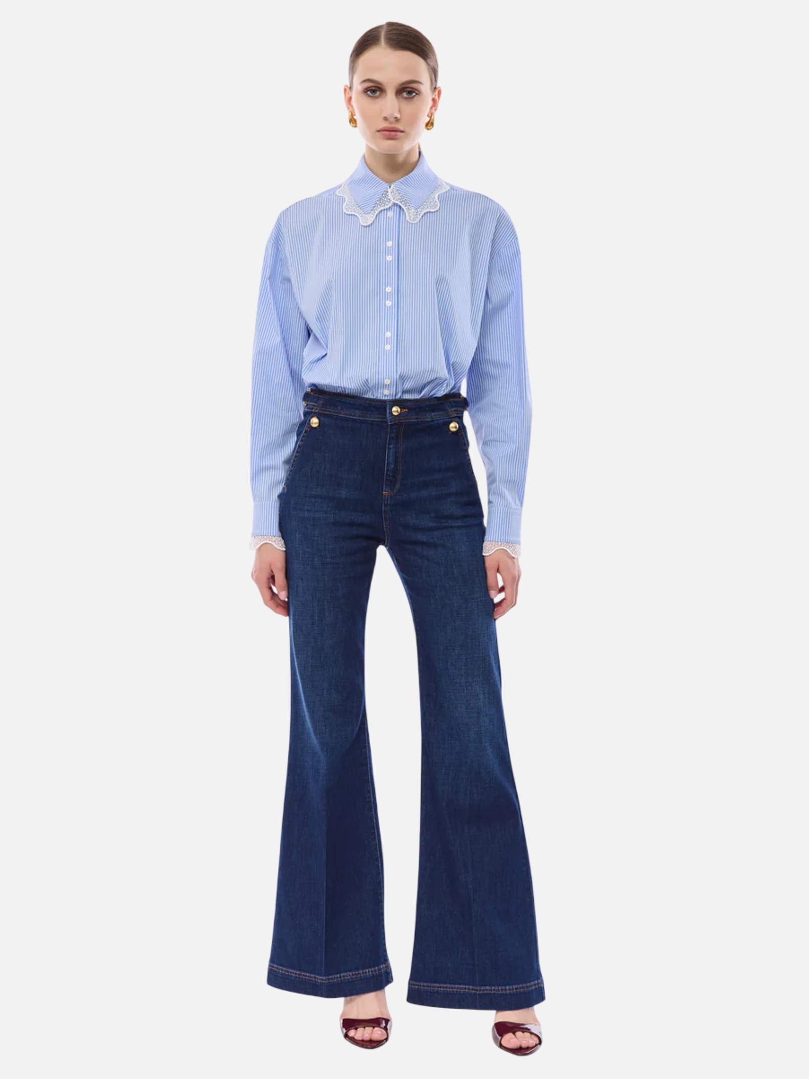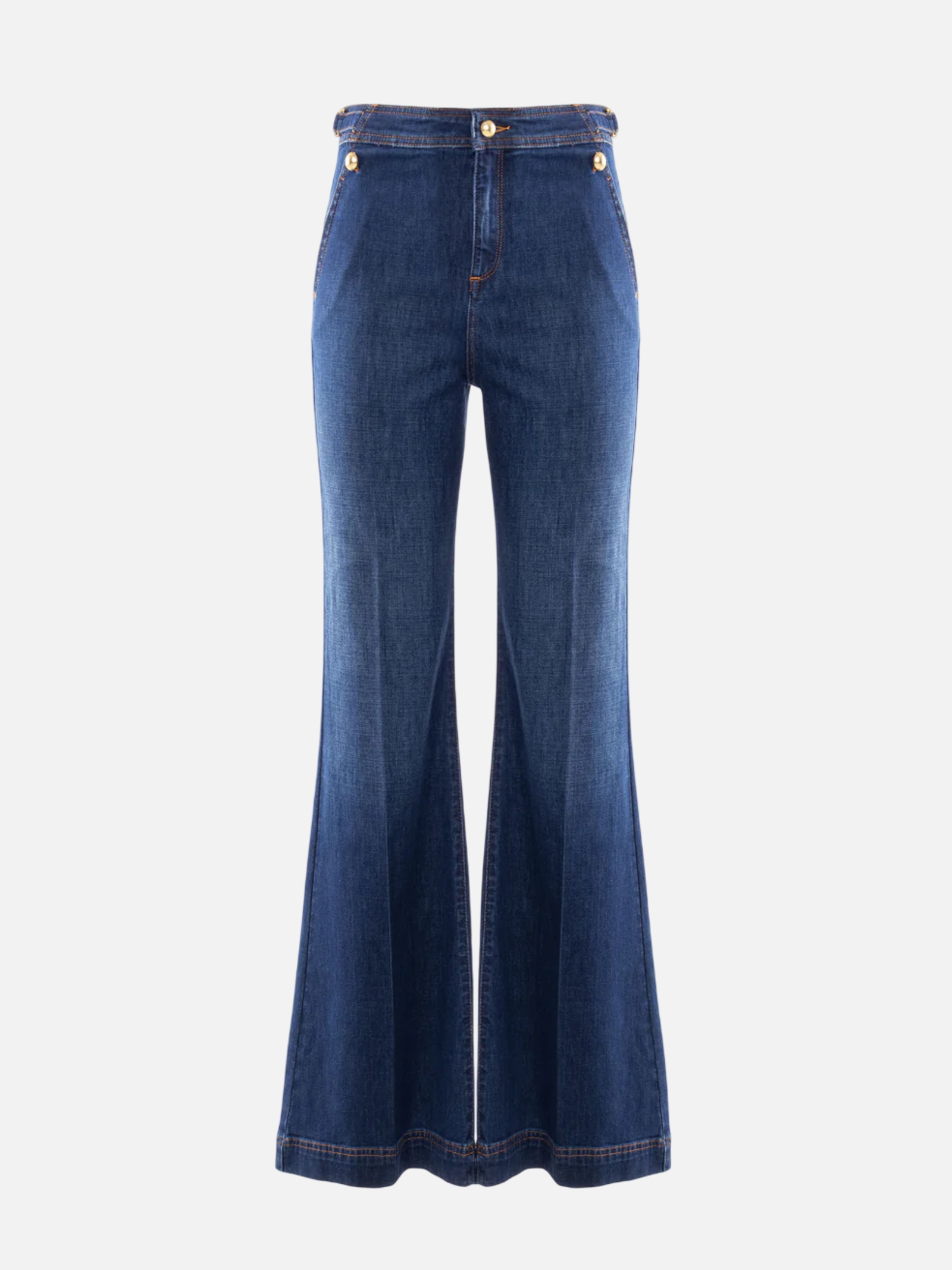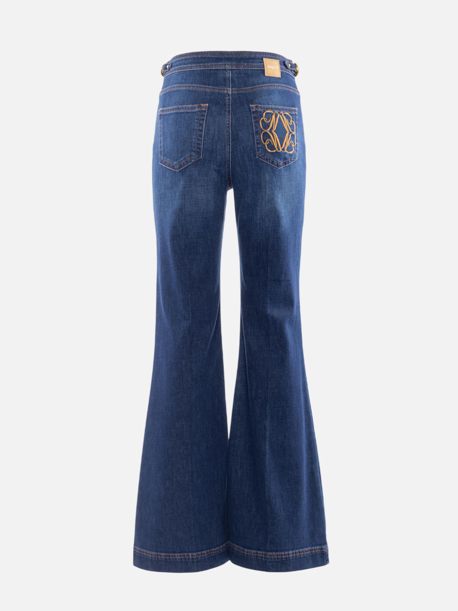 • Linee a zampa d'elefante e dettagli gioiello definiscono un denim dal fascino retrò. La vita alta è impreziosita da bottoni dorati a sbalzo e cinturini laterali regolabili, mentre le gambe ampie presentano una stiratura centrale permanente. Sul retro, la tasca applicata sfoggia un elaborato logo ricamato a contrasto, sigillo di uno stile ricercato e femminile.