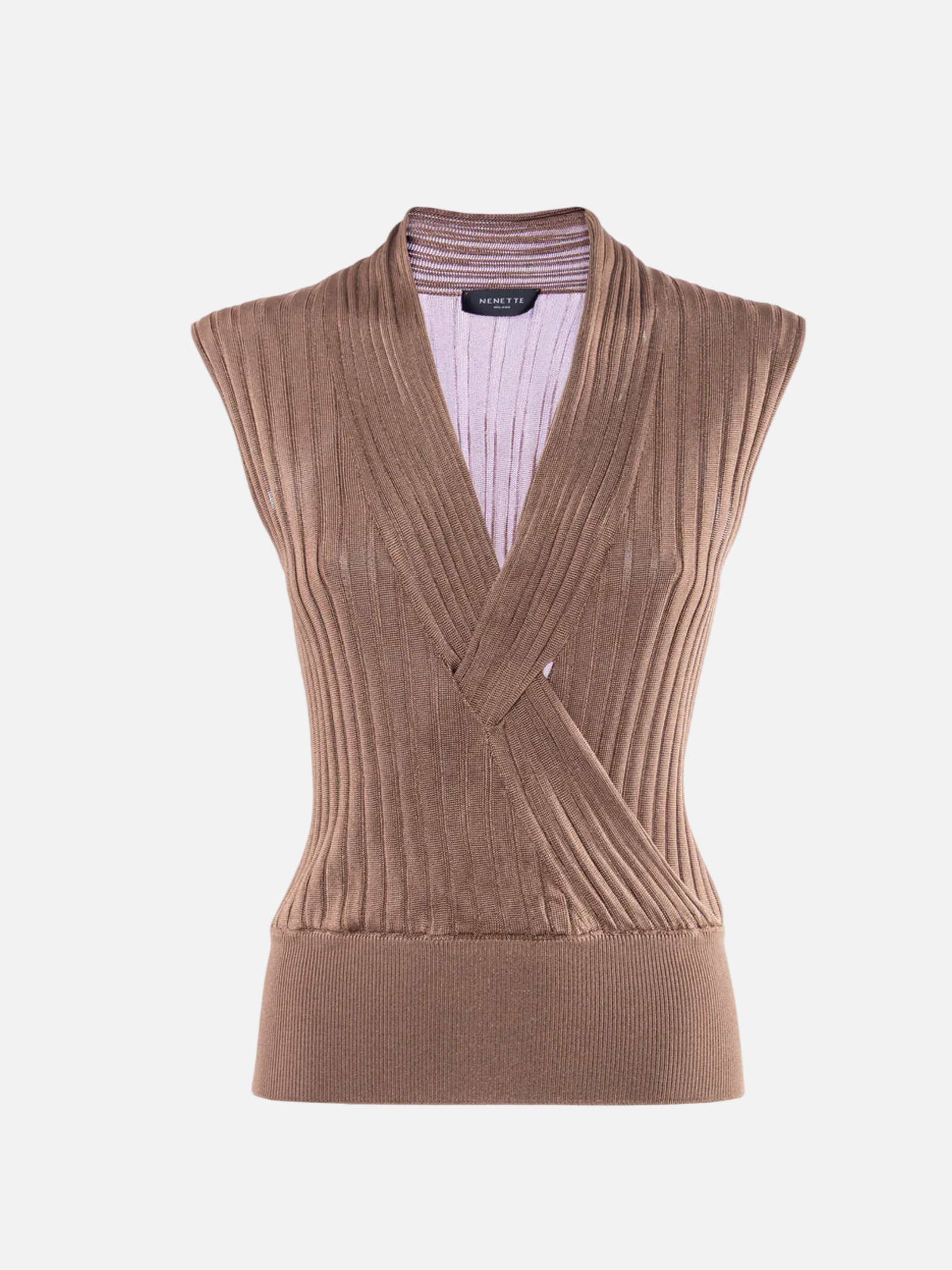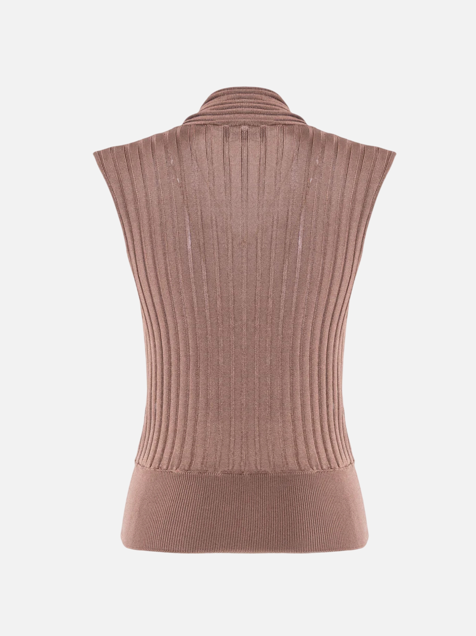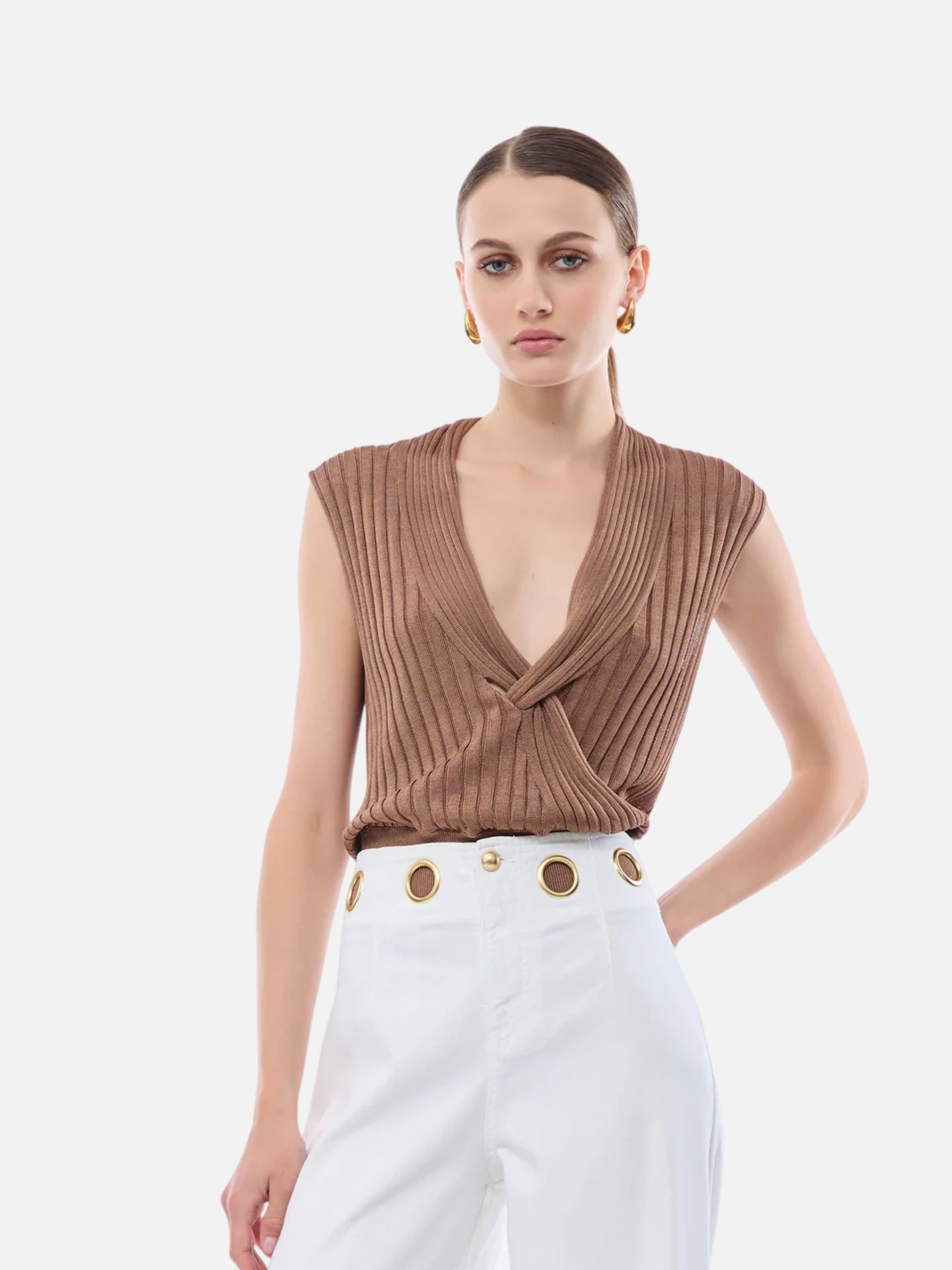 • Maglia senza maniche dal design strutturato con raffinata lavorazione a costine verticali. Il profondo scollo a V è valorizzato da un elegante motivo a incrocio frontale che esalta la silhouette, mentre le spalle larghe aggiungono un tocco moderno. Rifinita con un alto bordo elastico in vita, combina comfort e uno stile sofisticato perfetto.